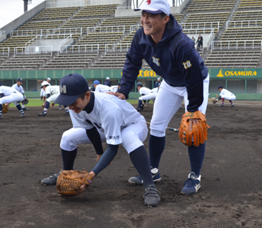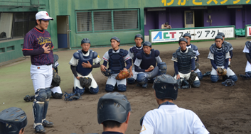 前半は、打撃技術を中心としてスイング指導や医科学サポートチームによるトレーニング指導を、後半は、ポジション別の守備技術や走塁の指導をしました。約5時間の実技講習を通して参加された球児のこれからの活躍を感じるとともに、指導することで自分自身の新たな発見をすることができ、有意義な講習会となりました。