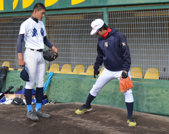打撃の指導する辻本選手投球の指導する岩本選手