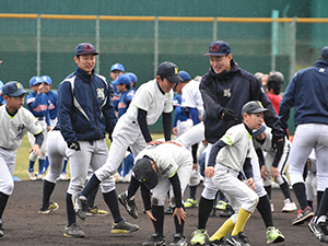 この野球教室は、京都野球協会・京都体育協会の共催で、第1回目から日本新薬の硬式野球部が指導していますが、今回は約240名が参加しました。12時の開会式の後、ウォーミングアップを行い、4つのグループに分かれて指導しました。メニューは、打撃練習・守備練習・投球練習・トレーニングの4つ。参加者は、各メニューを順番に30分ずつすべての指導を受けました。