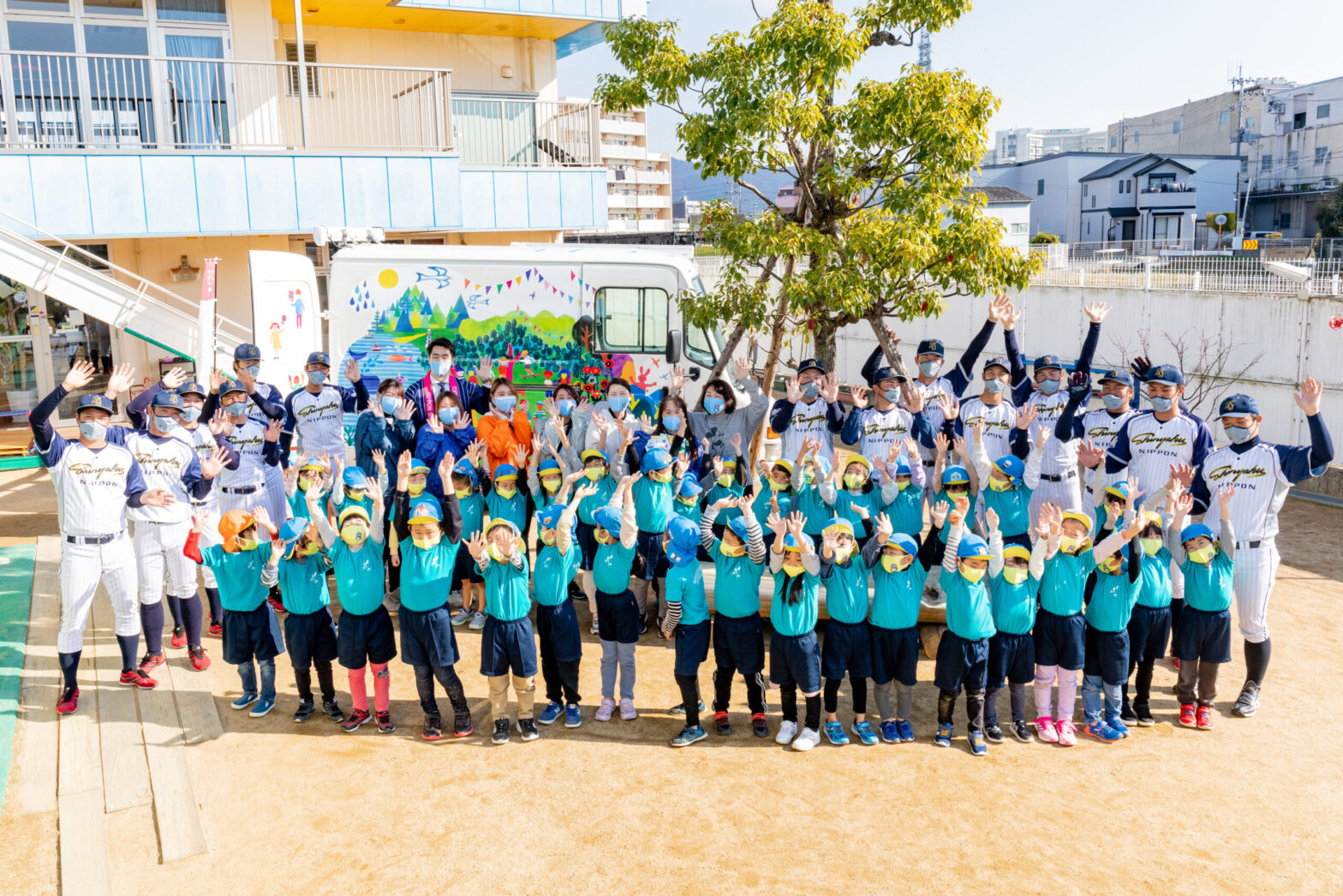2021年12月15日、宇治市にある槇島ひいらぎこどもを訪問し、ティーボール教室をはじめとする運動教室を実施しました。また今回は、園庭に「きらきら未来ゴー!」も設置し、読書体験の場も提供しました。年少から年長まで約120名の子どもたちが参加しました。運動教室では、年齢に応じて内容を少しずつ変えて、「投げる・打つ・走る」を体験してもらいました。天候にも恵まれ、子どもたちは、「ヤッター!」「ナイス!」と喜びの声をあげながら、最高の笑顔を見せてくれました。